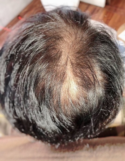男性型脱毛症の症状で、エアエクでの施術では難しいため、まずはポレーションで、地毛を育毛するメニューをご提案。